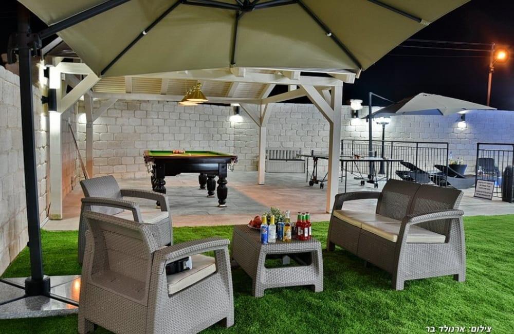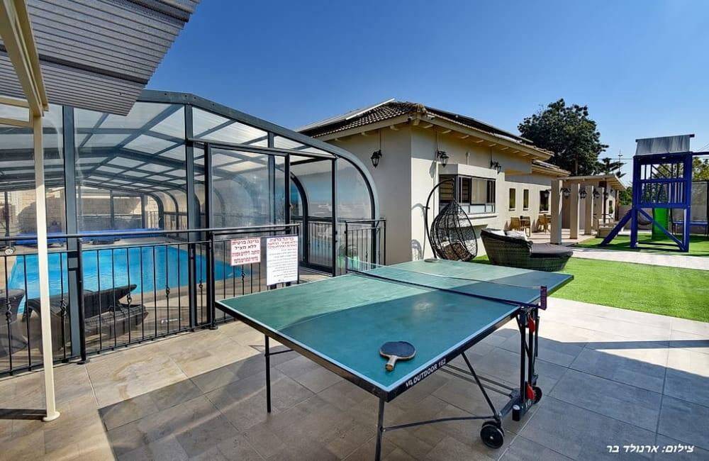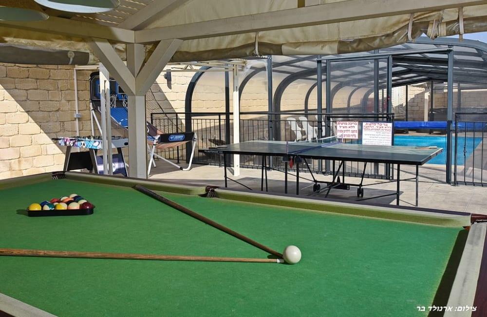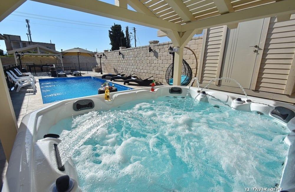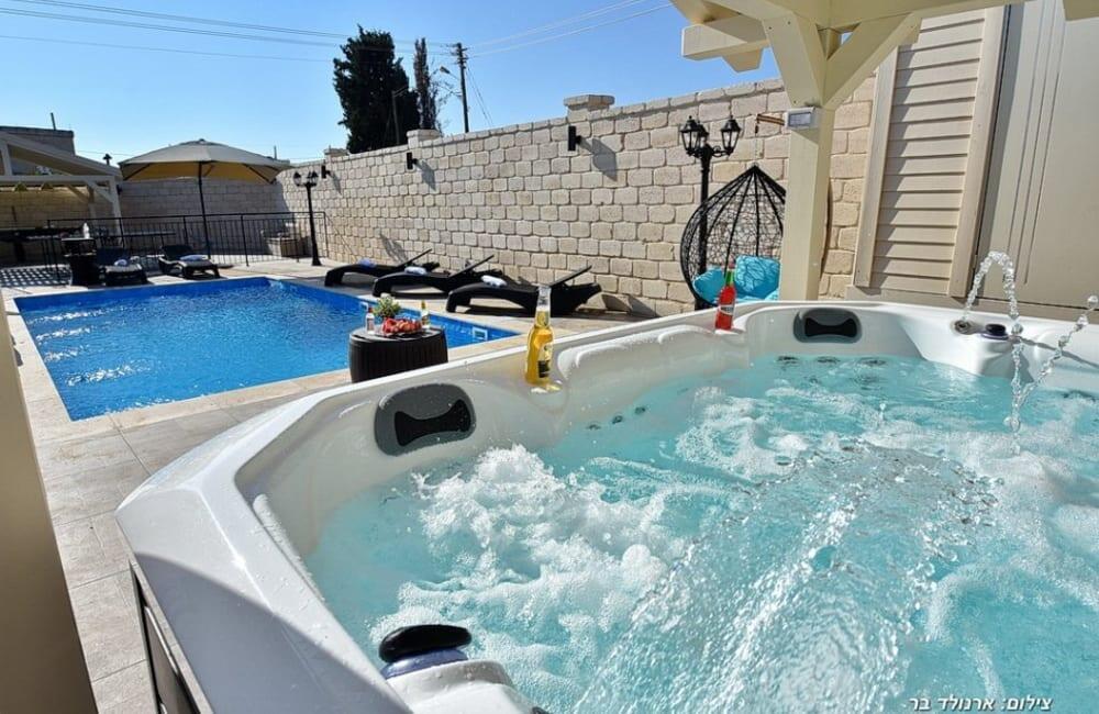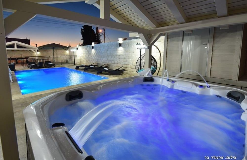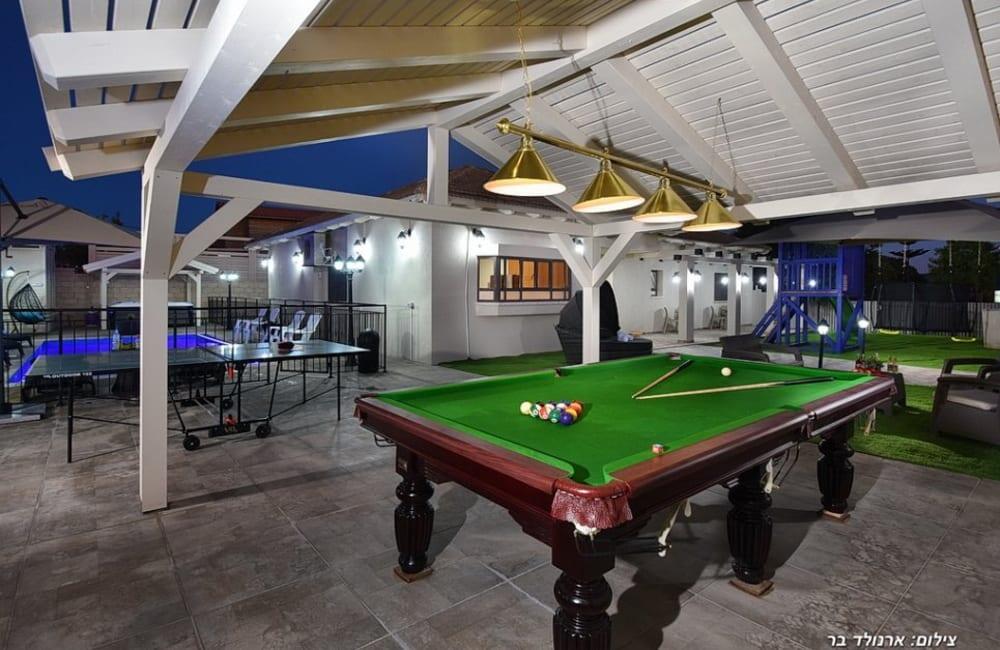 בחצר מחכה לכם בריכת שחייה מחוממת ומגודרת בגודל 8×4 מטר, ג'קוזי ספא ל-7 אורחים, פינות ישיבה, שולחן סנוקר ופינג פונג לילדים ולמבוגרים.