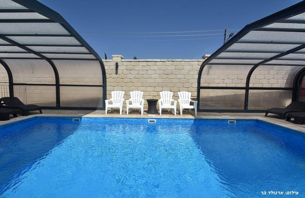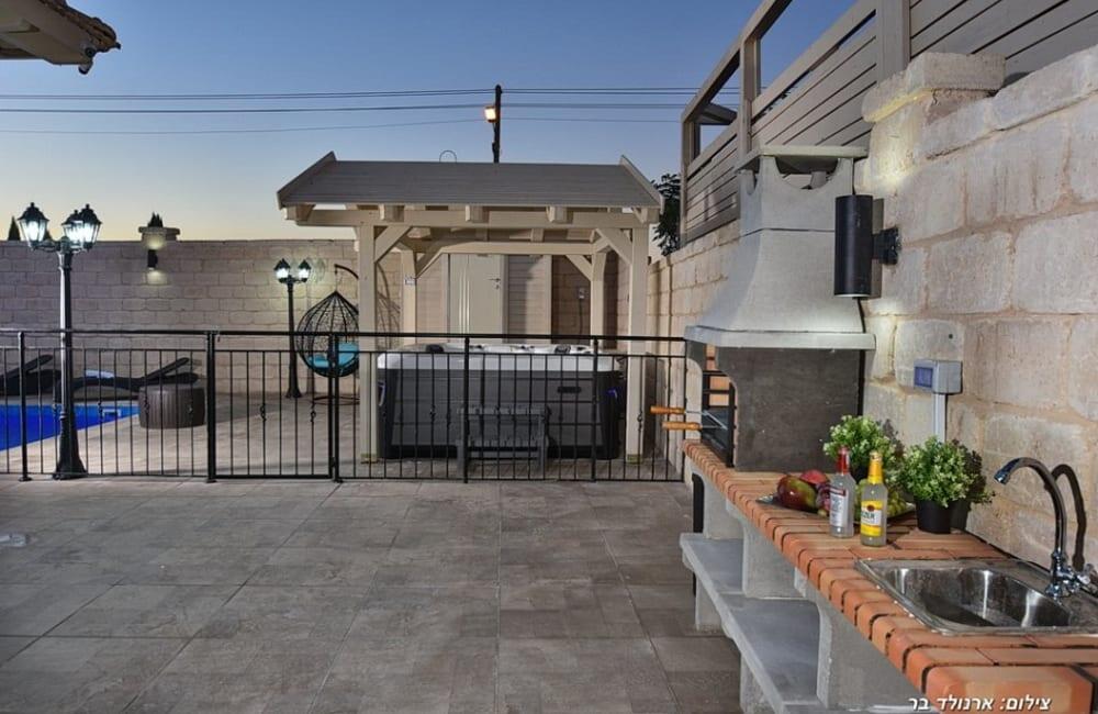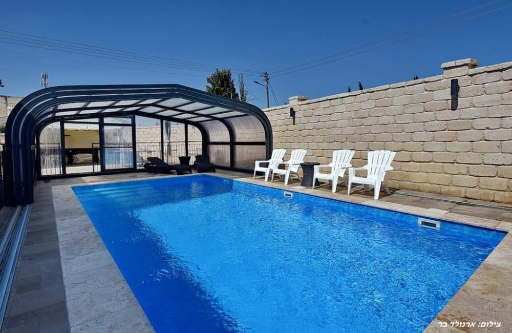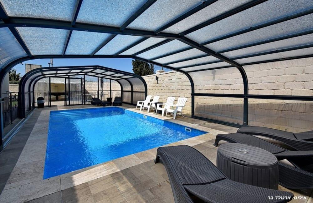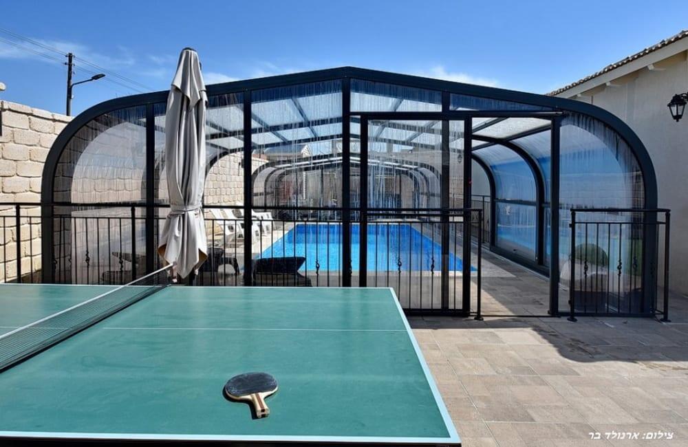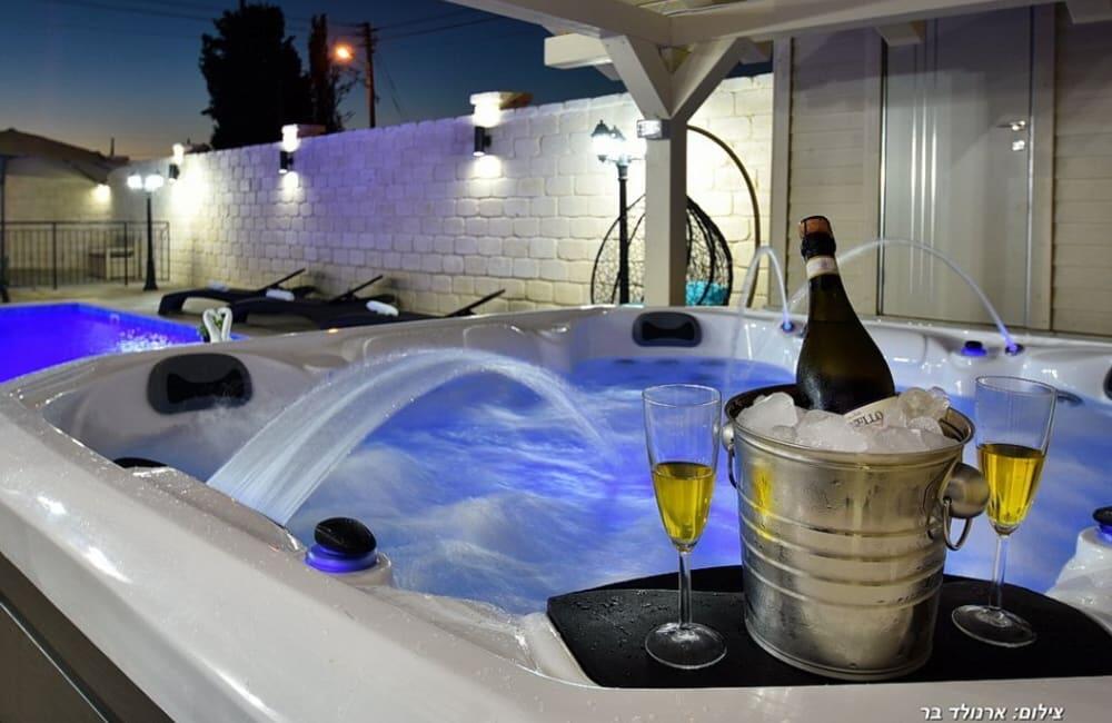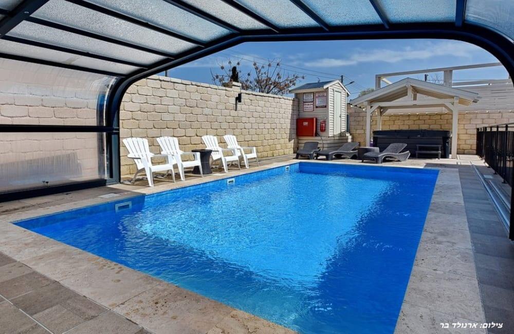 בחצר מחכה לכם בריכת שחייה מחוממת ומגודרת בגודל 8×4 מטר, ג'קוזי ספא ל-7 אורחים, פינות ישיבה, שולחן סנוקר ופינג פונג לילדים ולמבוגרים.