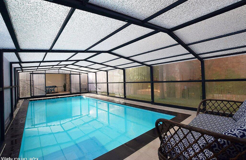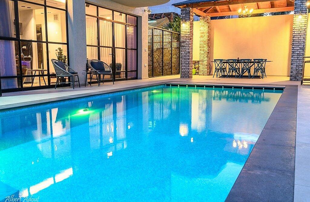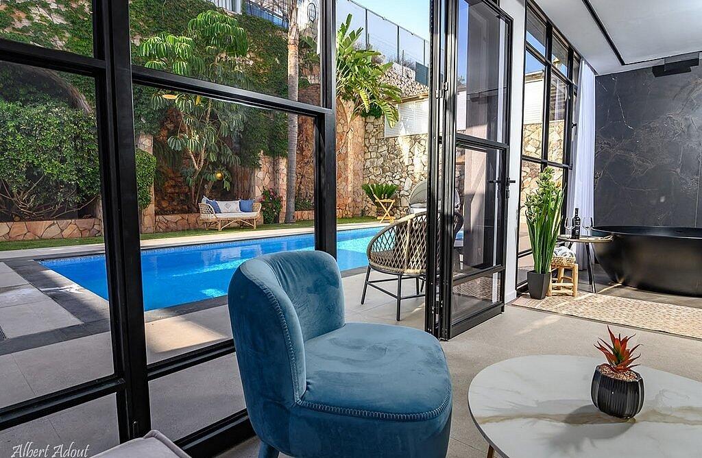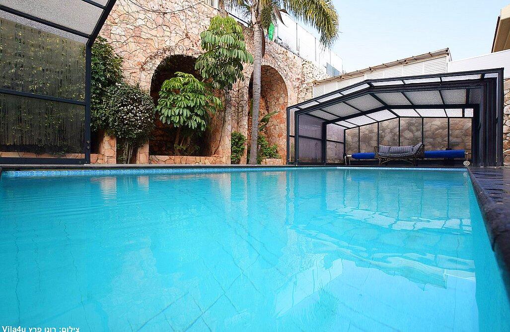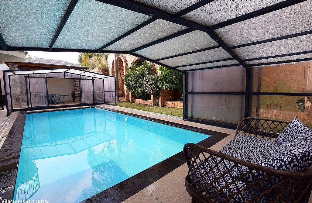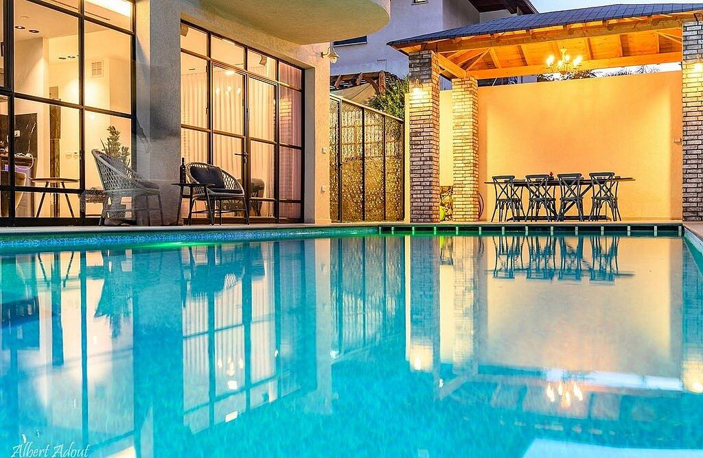 החצר המעוצבת והמטופחת כוללת את האטרקציה המרכזית – בריכה פרטית, מחוממת ומקורה בהתאם לעונה. אורחי הסוויטה יכולים להתחיל את היום בשחייה מרעננת ולסיים אותו ברחצה לילית בבריכה, עם תאורה קסומה. לצד הבריכה תמצאו פינות ישיבה נוחות, שולחן גינה, מטבח מאובזר ועמדת ברביקיו. דלת זכוכית גדולה מחברת בין הסלון של הסוויטה לבריכה, ומאפשרת לכם ליהנות מחוויית נופש אינטימית ומפנקת.