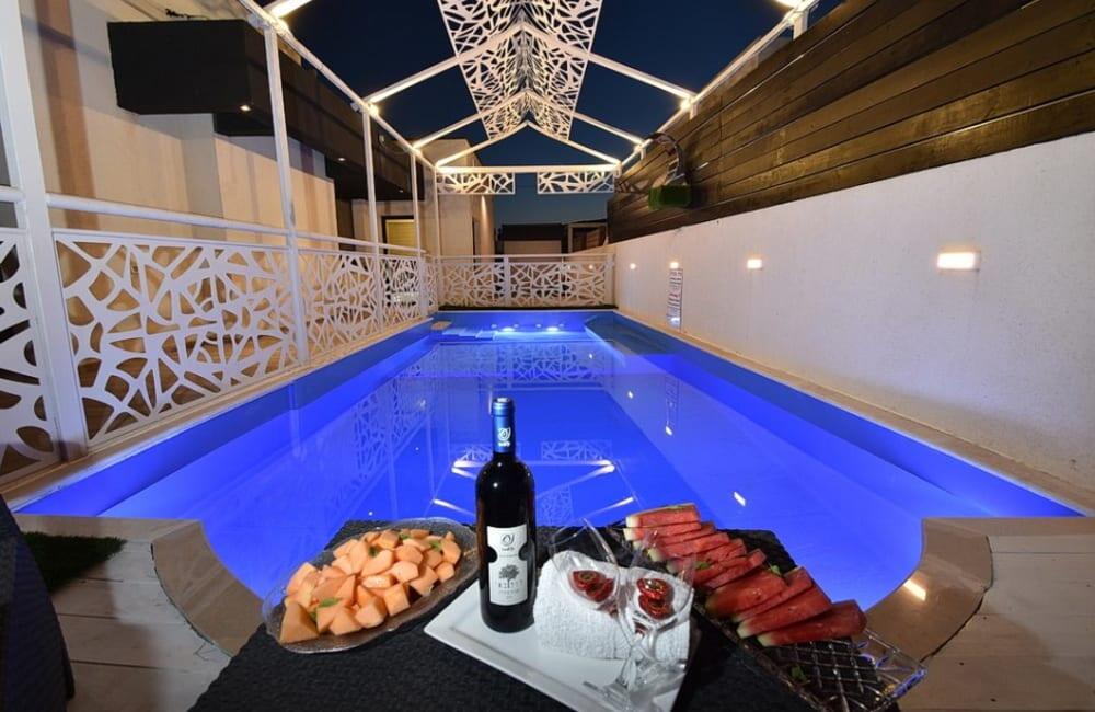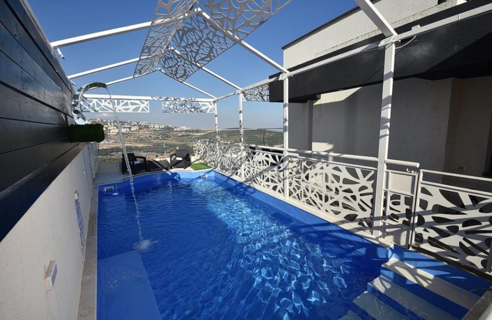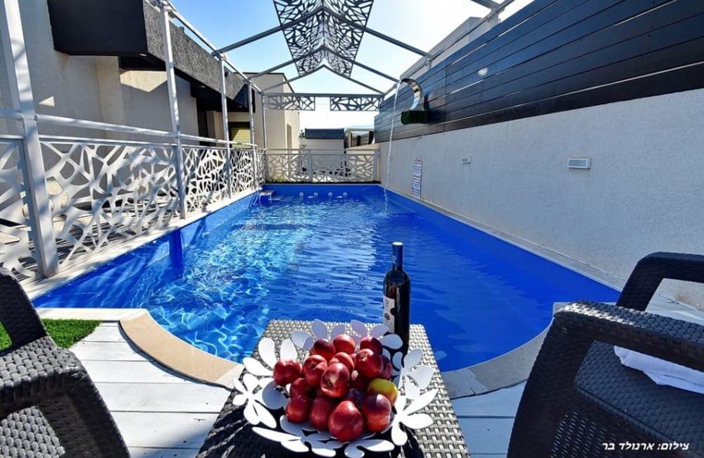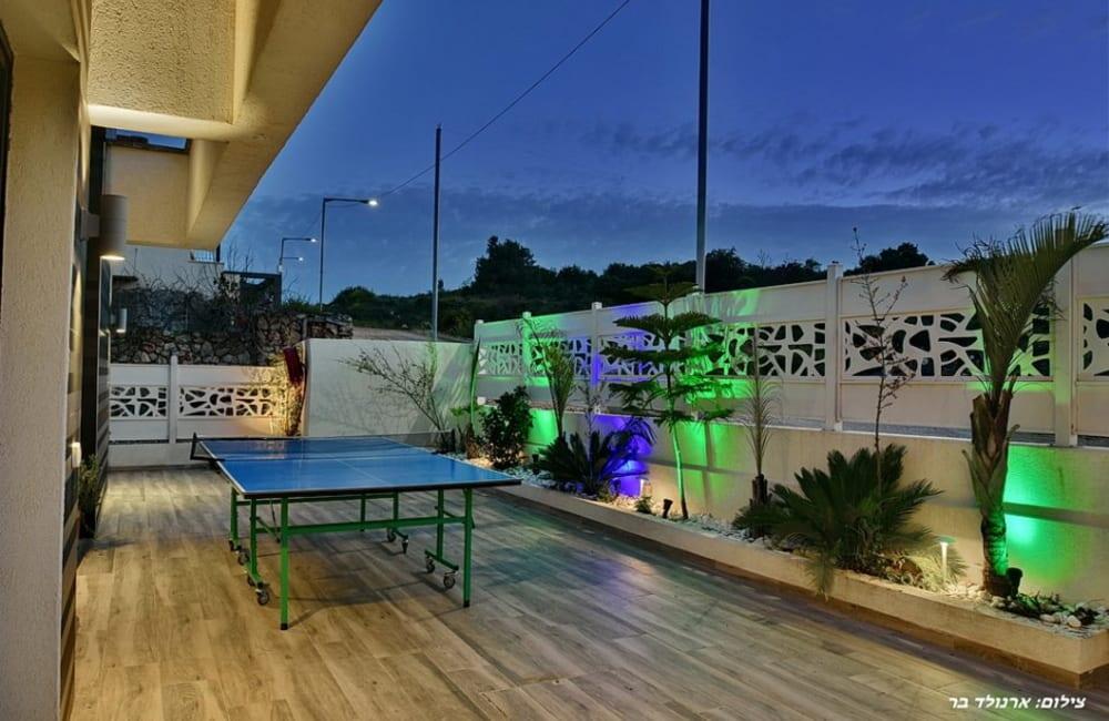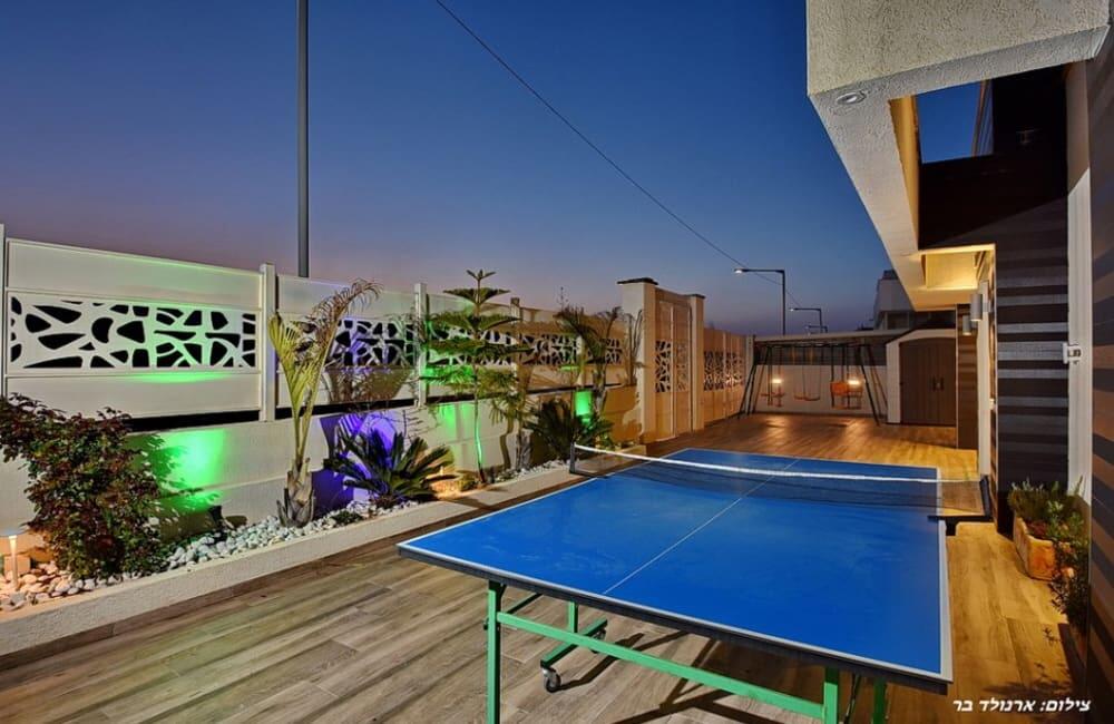 במתחם החוץ: בריכה מחוממת, ג'קוזי ספא, פינג פונג, נדנדות וערסלים.
