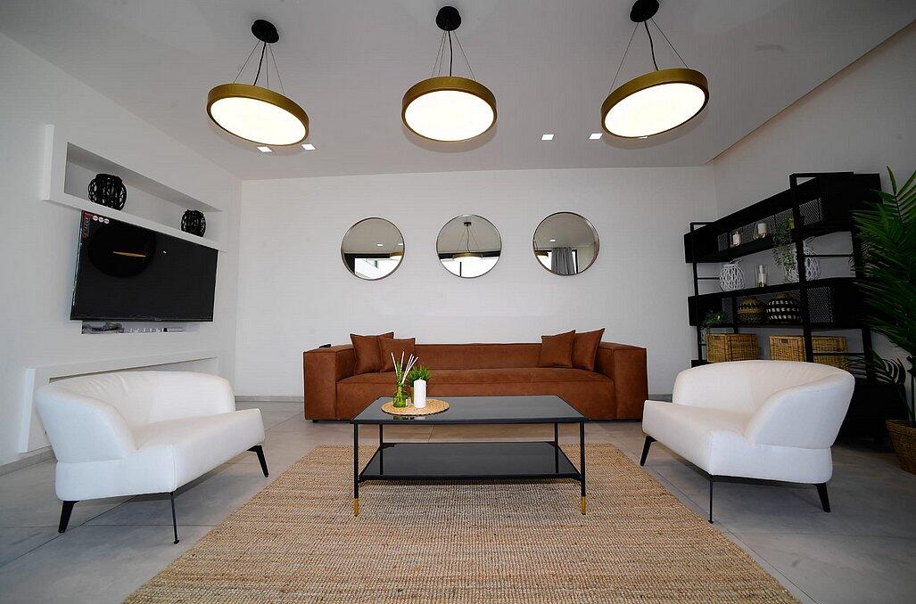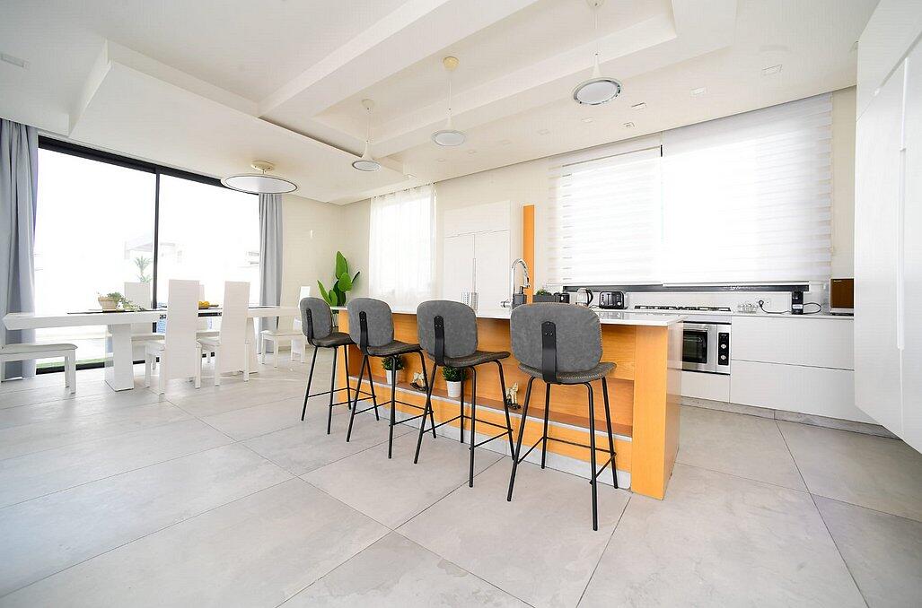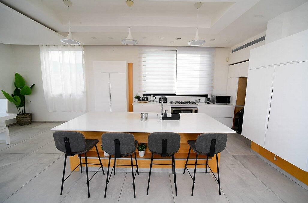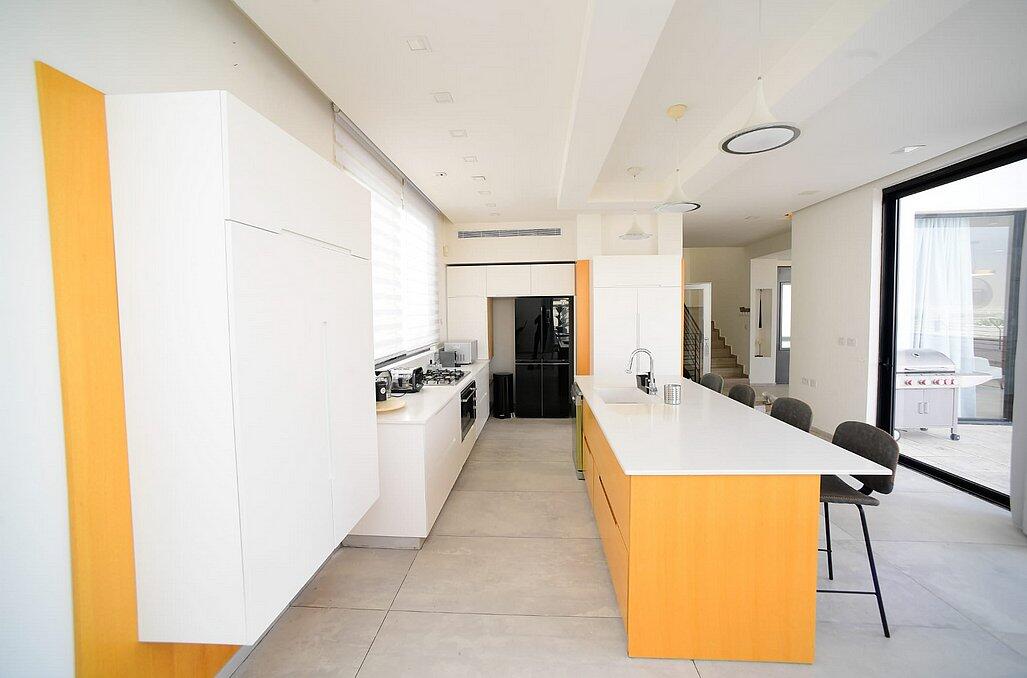 מהמטבח והסלון תוכלו לראות דרך חלונות ודלתות פנורמיים את הנוף המושלם לים ולמפרץ עם יציאה לרחבה גדולה לבריכה.