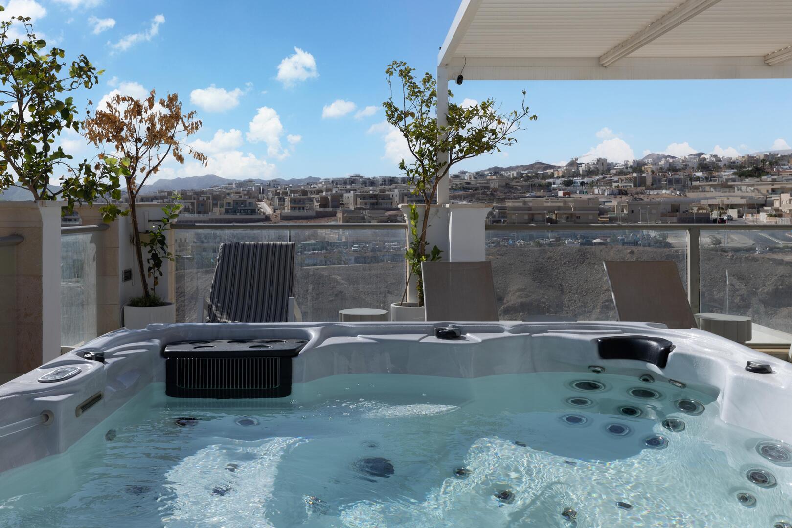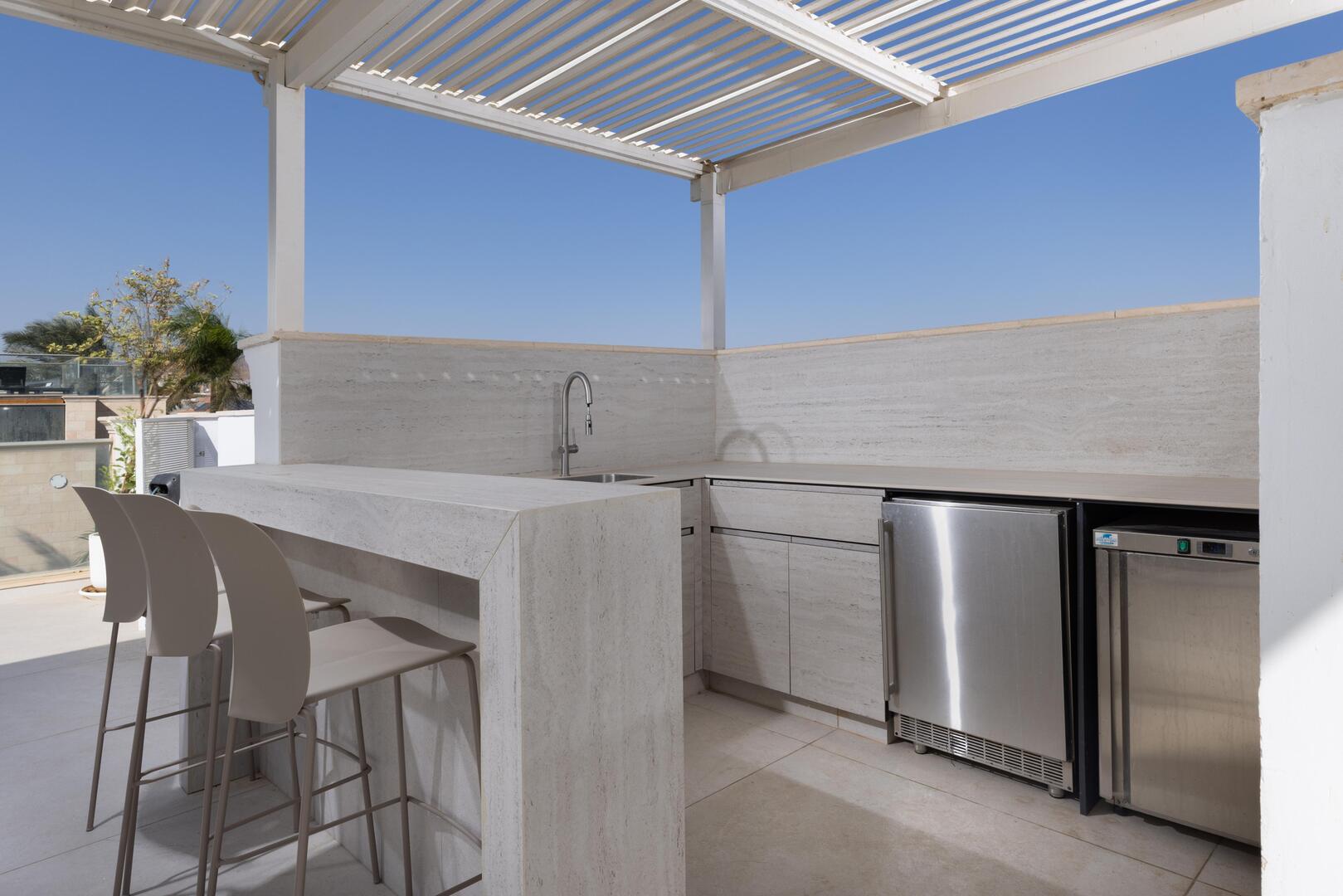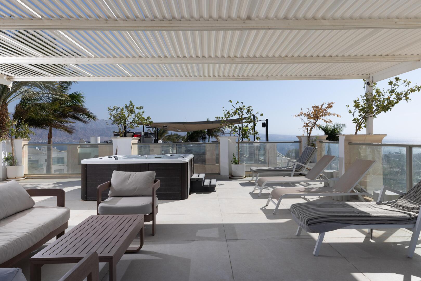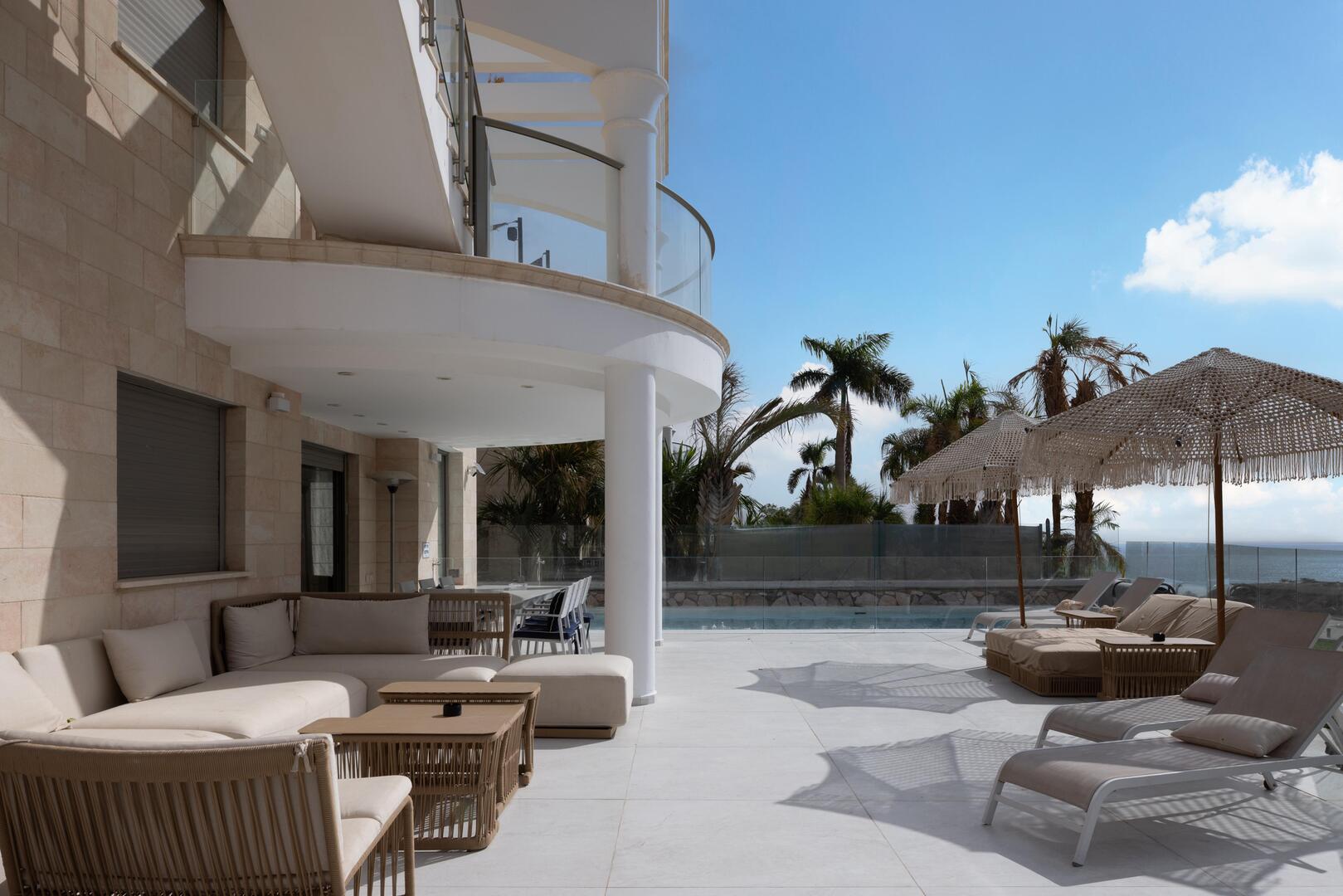 במתחם החיצוני ישנה בריכת שחייה ענקית, ג'קוזי ספא הממוקם מול נוף לים, עמדת מנגל מקצועית ומגוון פינות ישיבה נוחות.