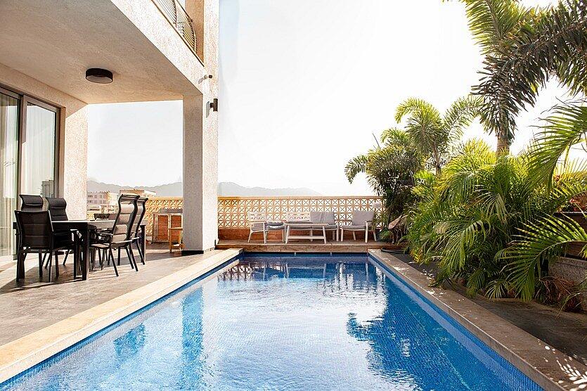 וילה רויאל הום אילת מציעה חוויית נופש יוקרתית למשפחות שרוצות לנפוש באילת. הוילה כוללת 5 חדרי שינה מרווחים, בהם סוויטת הורים מפנקת עם ג'קוזי פרטי, מטבח מאובזר ומסלון נעים. בחצר תמצאו בריכת שחייה צלולה, ריהוט גן נוח, פינת מנגל ונוף מדהים. מקום אידיאלי לחופשה רגועה ומפנקת.