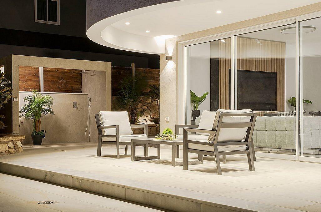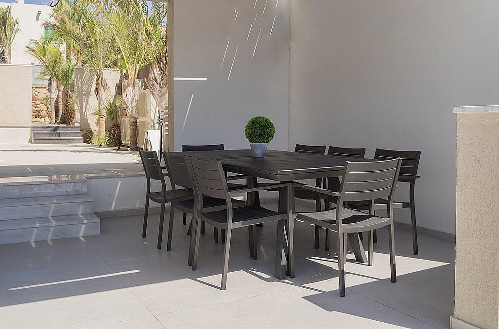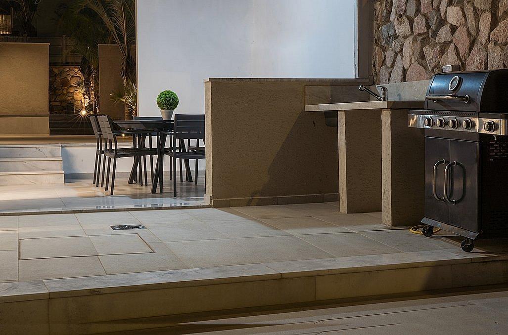 חצר גדולה עם בריכת שחייה מחוממת ומגודרת, פינת מנגל על גז, ריהוט גן, פינות שיזוף ועוד.