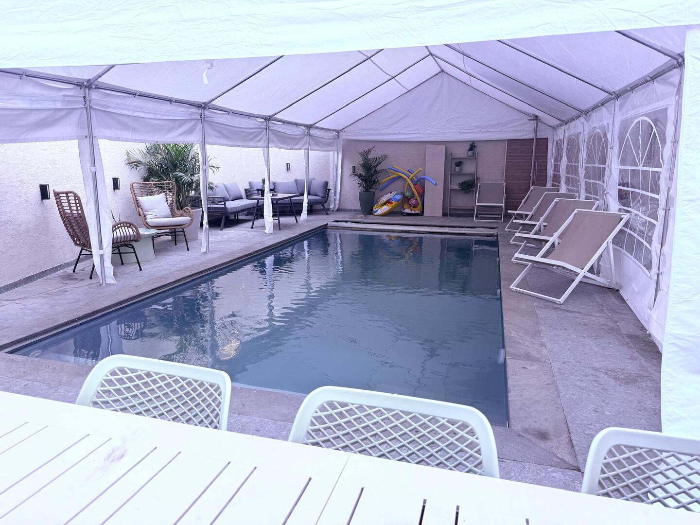 הילדים נהנים ממתקנים מגוונים כמו טרמפולינה, פינג פונג וכדורגל שולחן, בזמן שאתם נרגעים בבריכה המחוממת והמקורה.