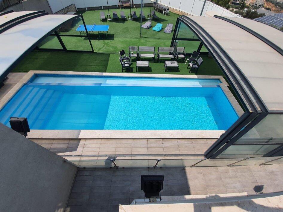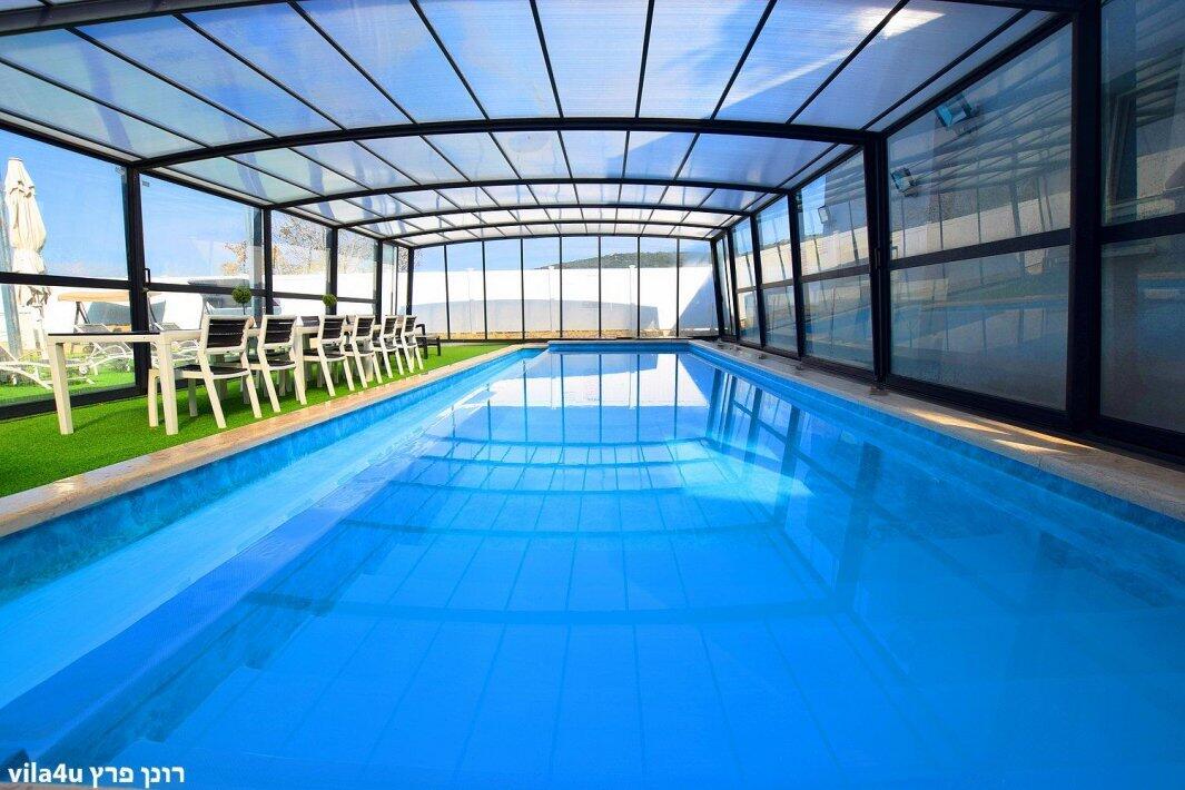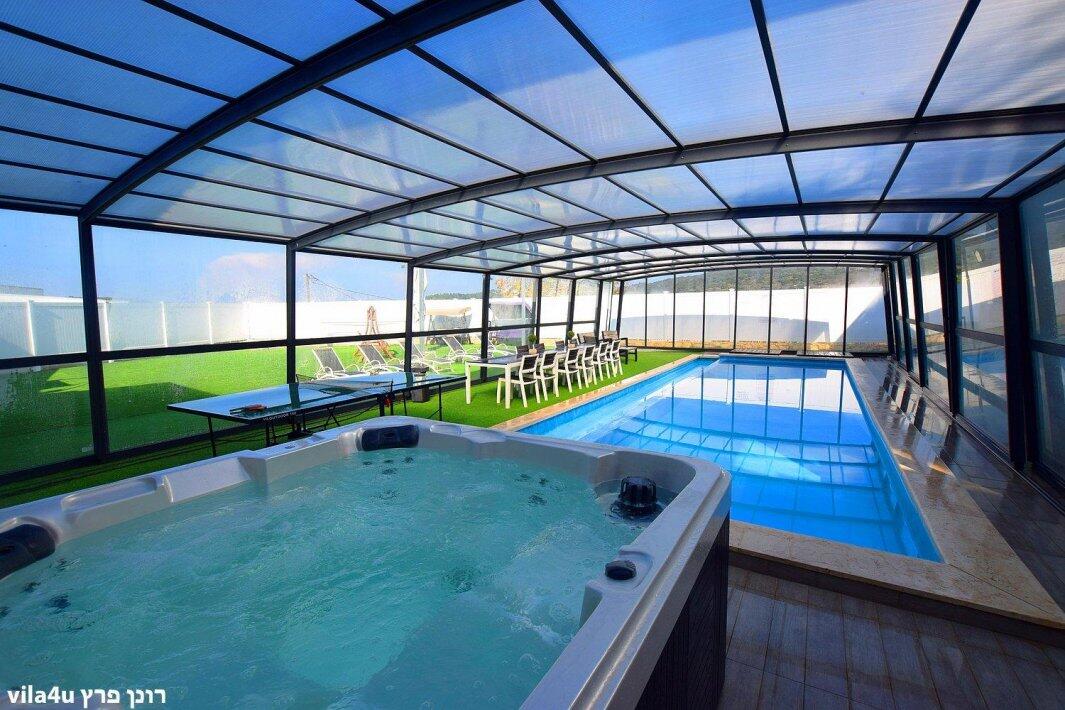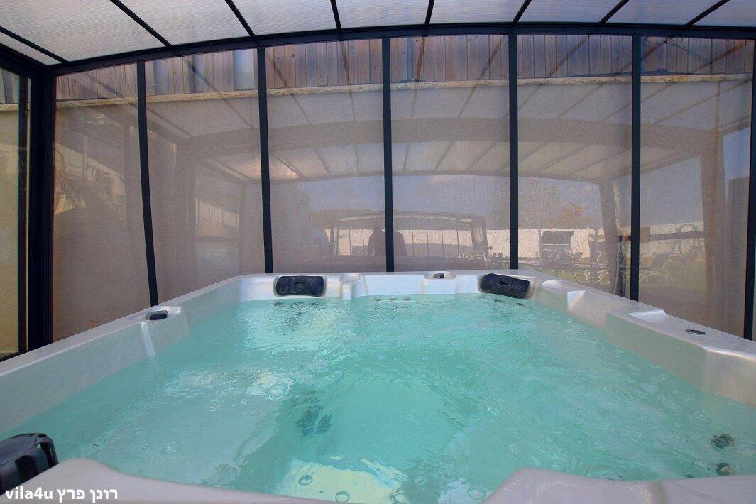 מתחם חיצוני עם בריכת שחייה מחוממת מקורה בגודל 14 מטר שלכל אורכה ישנה בריכה בעומק 20 ס"מ לתינוקות שלכם, ג'קוזי ספא, מדשאות ועוד שלל הפתעות ופינוקים. מהרו להזמין..