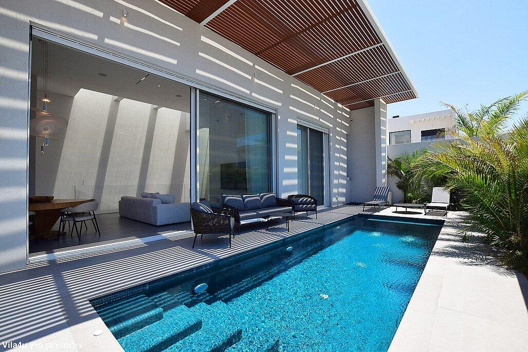 חצר מפנקת עם בריכה פרטית ומטבח חיצוני משוכלל, פינות ישיבה מוצלות, ריהוט גן ופינות שיזוף יוקרתיות.