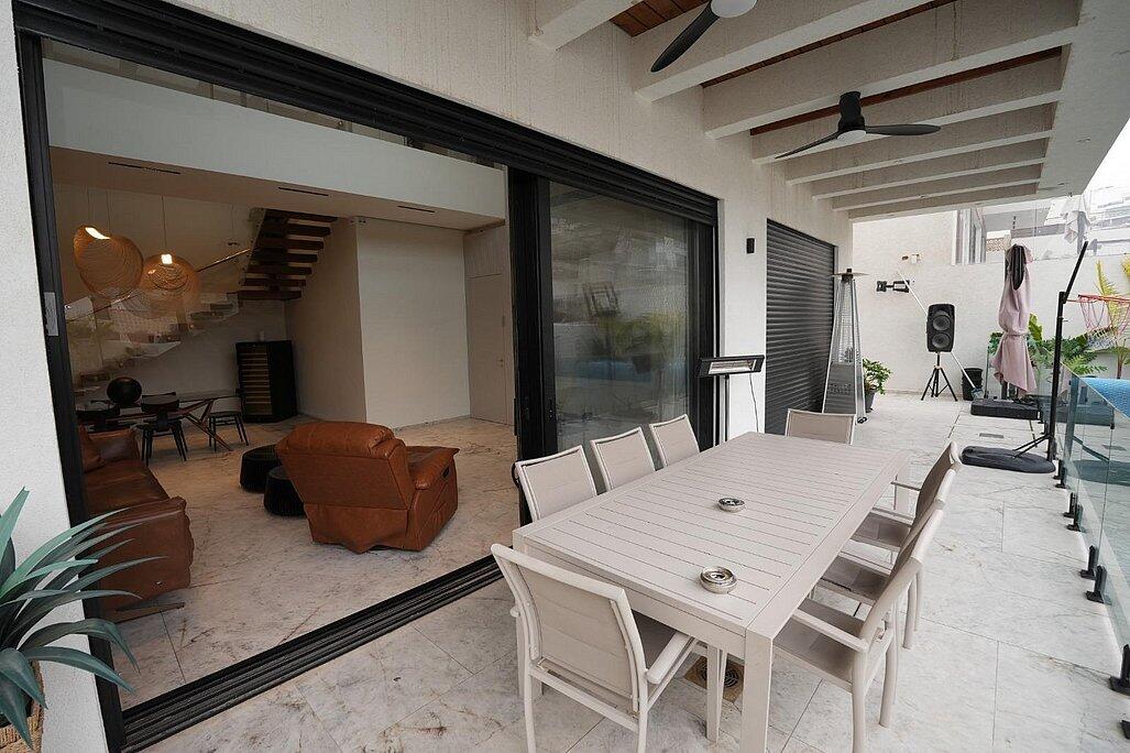 מרפסת, מטבח חוץ, ברביקיו, משחקים ופינות ישיבה מעוצבות.