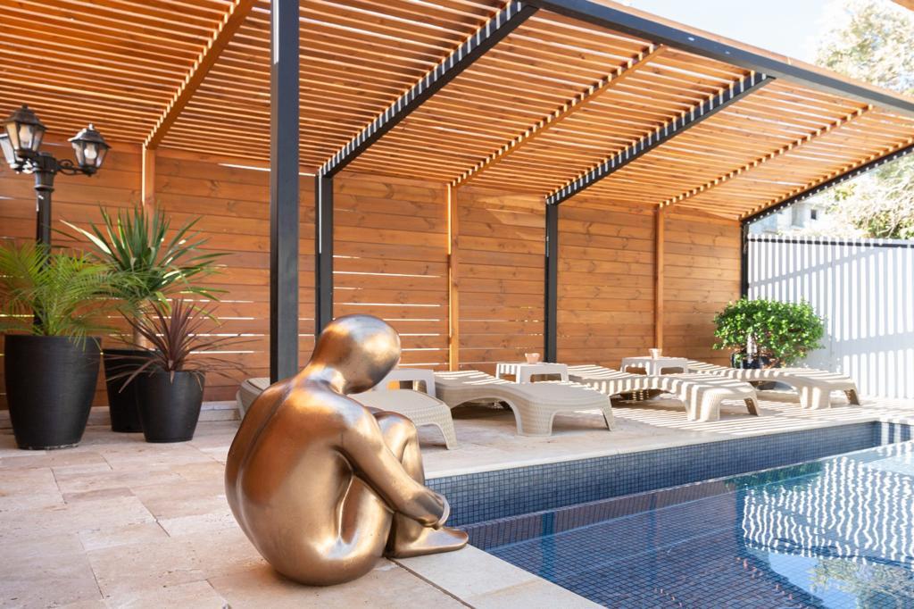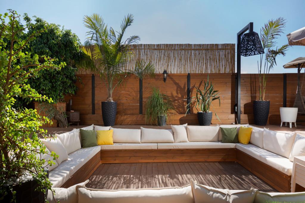 החצר עטופה עצי נוי, צמחייה ירוקה וריהוט גן יוקרתי.